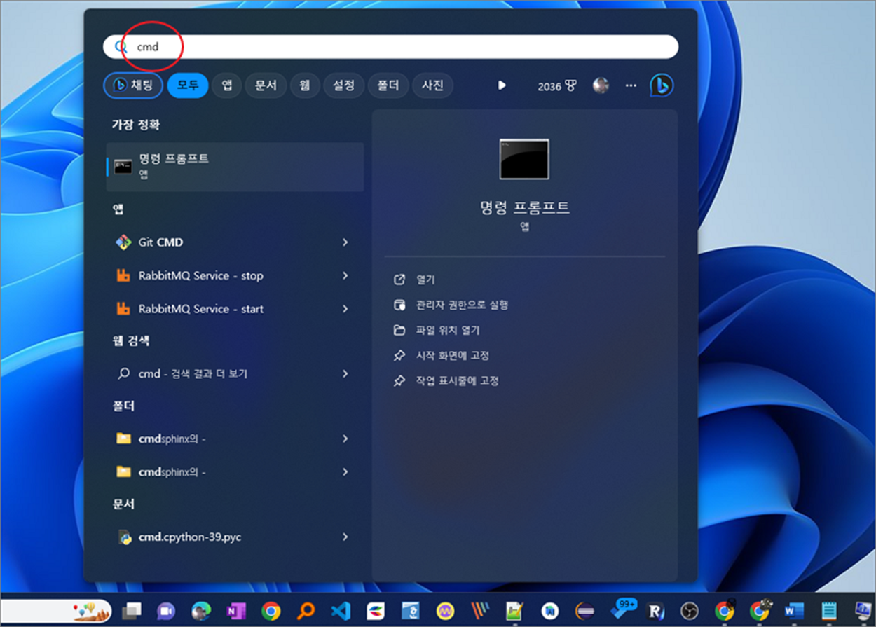 ▼ 기존 메모리의 타입을 wmic 유틸을 이용해서 알아보겠습니다. 검색창을 이용해서 명령어를 입력할 명령 프롬프트를 실행합니다.