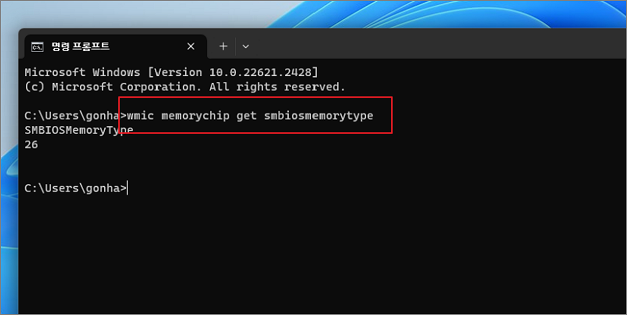 ▼ 명령 프롬프트에서 다음과 같이 입력합니다. SMBIOSMemoryType 은 메모리 타입의 번호인데, 26 이 DDD4 이고 24 가 DDR3 입니다. DDR2 는 21, 22 입니다.