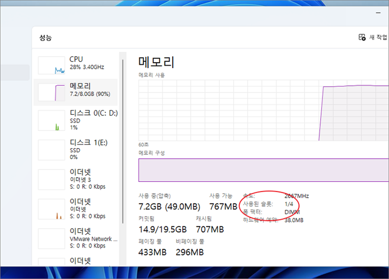 ▼ 메모리 창에서 오른쪽 하단 “사용된 슬롯” 을 확인합니다. 현재는 1/4 로 4개의 슬롯 중 하나만 남아 있다고 생각