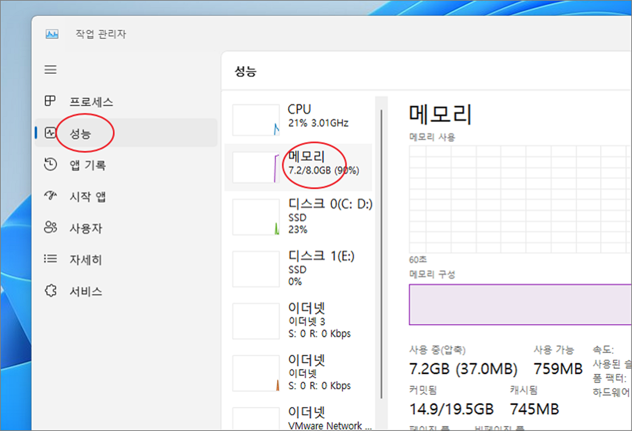 ▼ 작업 관리자 창에서 왼쪽 사이드에 성능 메뉴를 선택합니다. 오른쪽 화면으로 가서 “메모리” 를 클릭합니다.