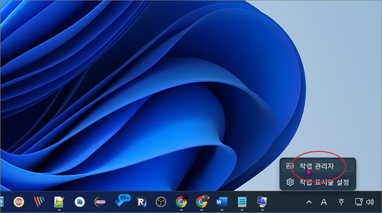 ▼ 작업 표시줄 에서 오른쪽 마우스를 눌러 “작업 관리자” 를 선택합니다.