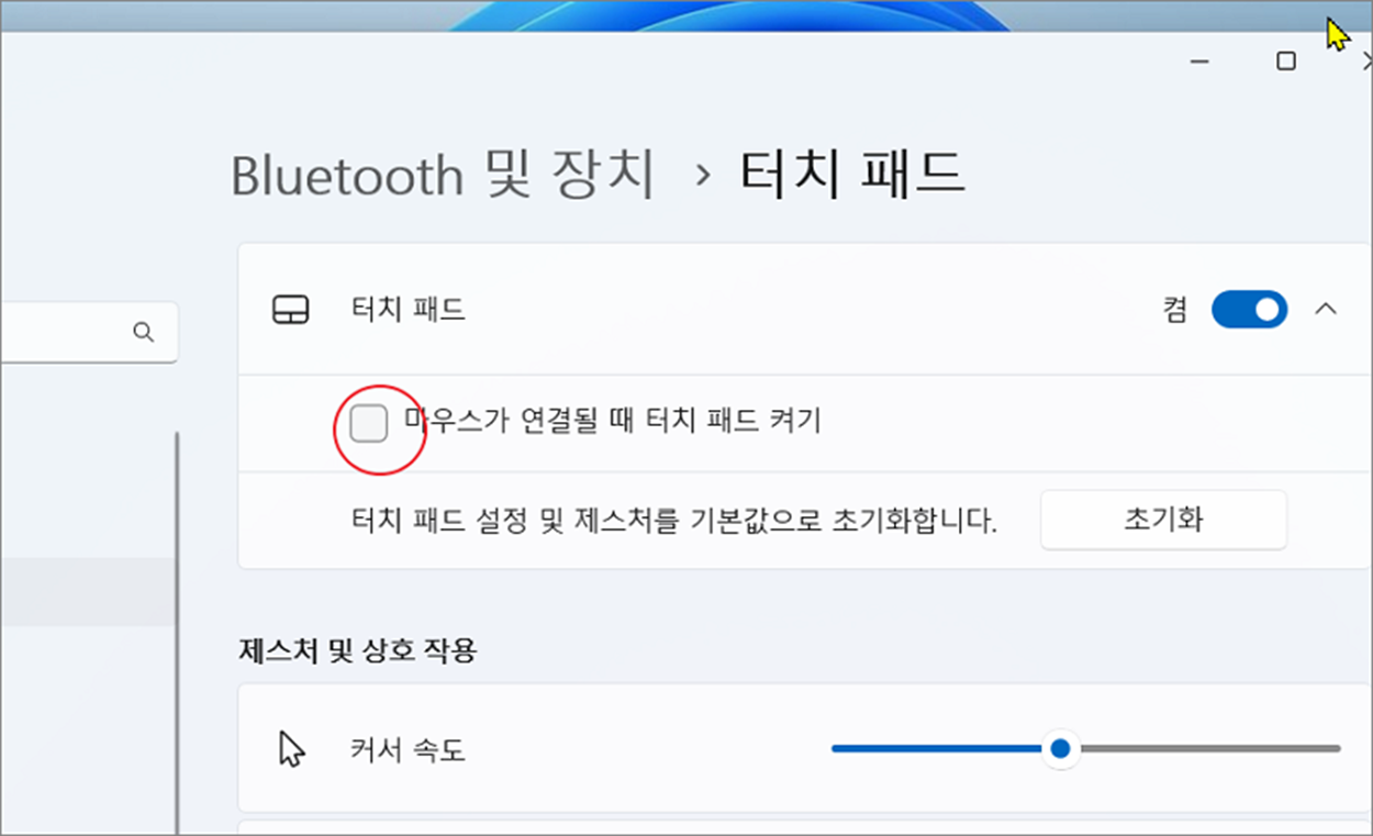 ▼ 바로 아래 “마우스가 연결될 때 터치 패드 켜기” 옵션을 해제하면 마우스가 없는 경우에만 터치 패드를 비활성화 할 수 있습니다.
