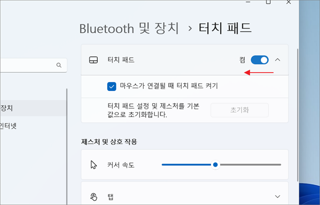 ▼ 터치 패드 설정 화면에서 제일 상단에 스위칭 컨트롤을 클릭해서 켜거나 끕니다.