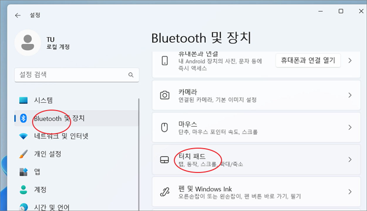 ▼ 설정에서 “블루투스 및 장치” 를 선택합니다. 그리고 오른쪽 화면에서 “터치 패드” 메뉴를 찾아 클릭합니다.