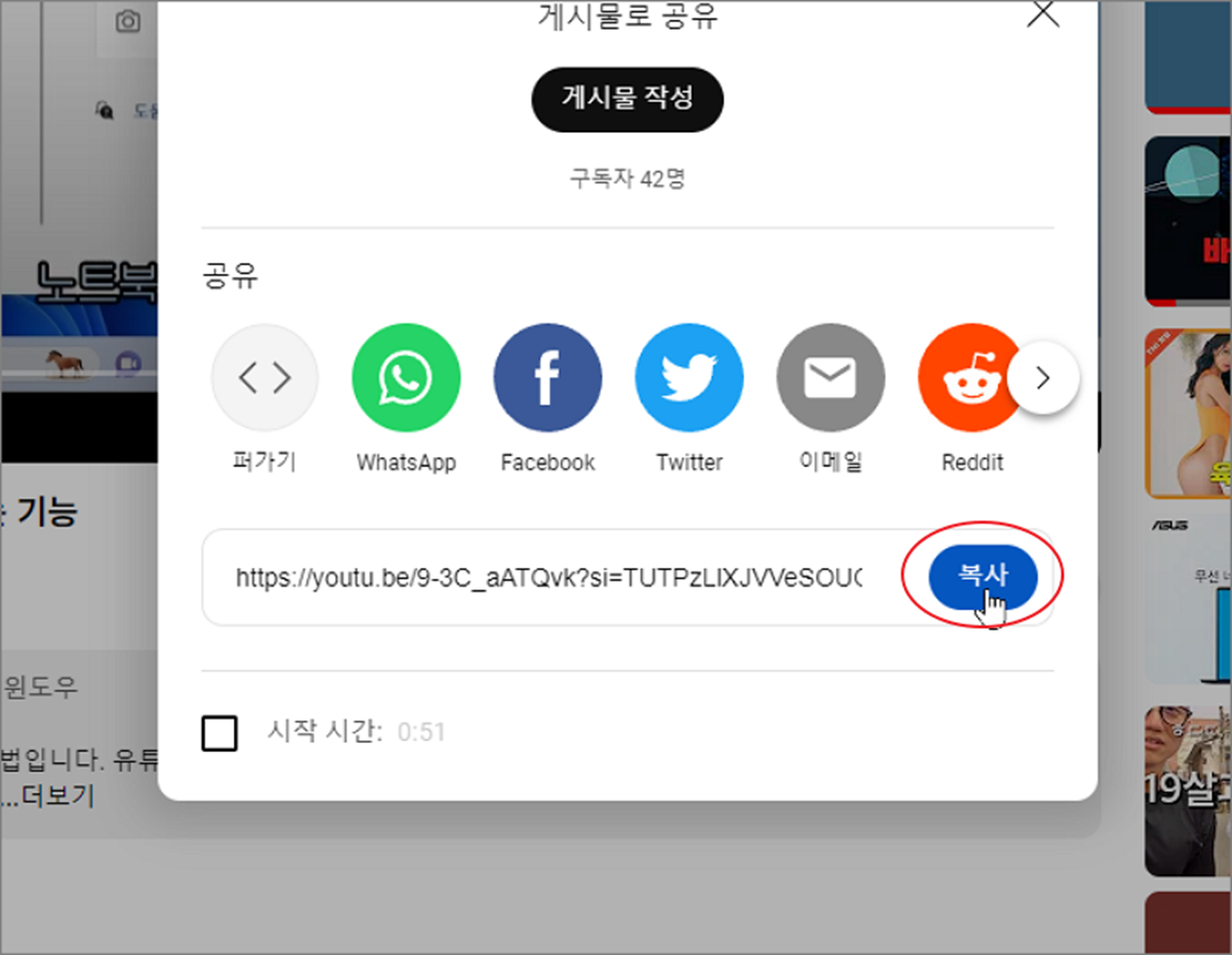▼ 게시물 공유 창이 뜨면 주소가 있는 입력란 오른쪽 끝에 “복사” 버튼을 클릭합니다.
