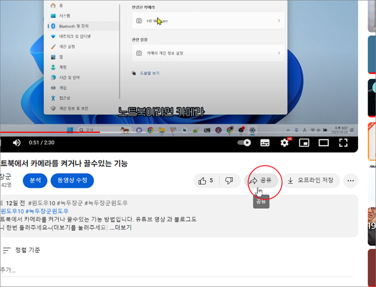 ▼ 유튜브에 작성한 영상을 티스토리 블로그에 삽입하는 방법은 간단합니다. 이전에는 플러그인을 사용했지만 지금은 링크 주소를 넣기만 하면 됩니다. 먼저 삽입할 영상 주소를 가져와야겠죠. 유튜브 영상에서 하단 공유 버튼을 클릭합니다.