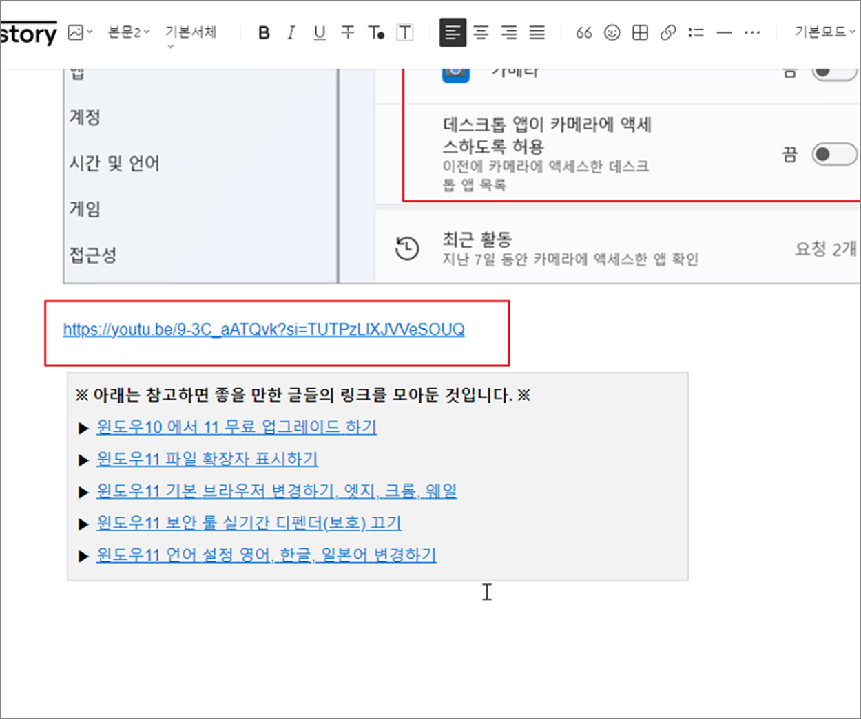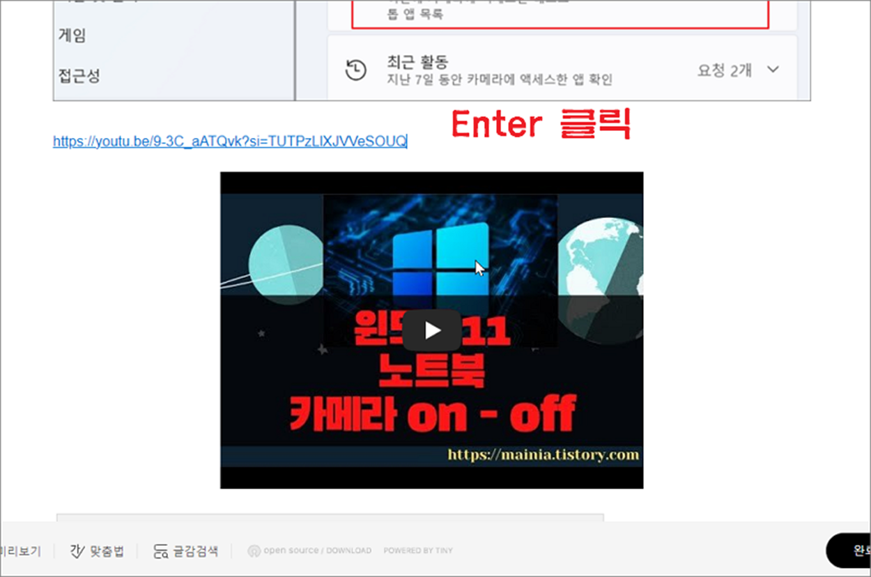▼ 이렇게 복사한 주소는 티스토리 블로그 편집 란으로 적당한 곳에 주소를 붙여 넣습니다. 그림처럼 Ctrl + V 를 눌러 주소를 복사하고 Enter 를 누릅니다.
