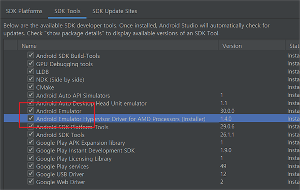 ▼ 다음은 Android Emulator 과 Android Emulator Hypervisor Driver for AMD Processes 가 설치되었는지 확인합니다. 그리고 최신 버전으로 업데이트가 되었는지도 확인합니다.