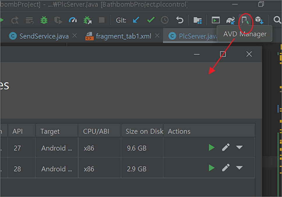 ▼ 먼저 에뮬레이터를 초기화해서 해결해 보겠습니다. 에뮬레이터를 관리하는 AVD Manager 를 실행합니다.