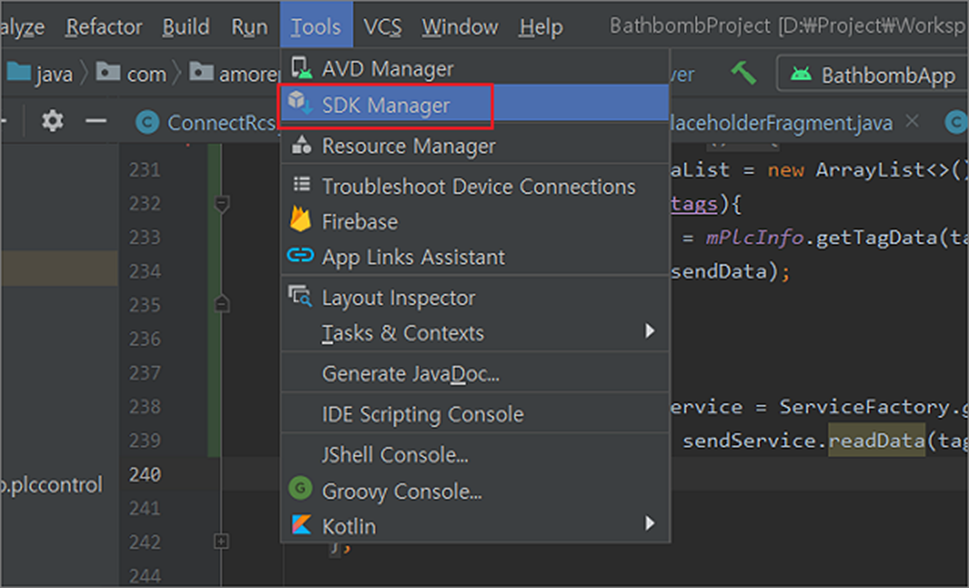 ▼ 다음은 SDK Tools 에서 Emulator 의 설치 여부와 최신 버전인지 확인하고 업데이트를 진행해 보겠습니다. 상단 메뉴 Tools > SDK Manager 메뉴를 선택합니다.
