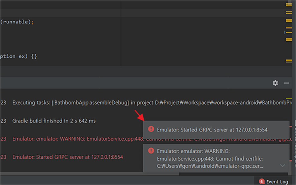 안드로이드스튜디오(AndroidStudio) Emulator: emulator: WARNING: EmulatorService.cpp:448: Cannot find certfile 오류
