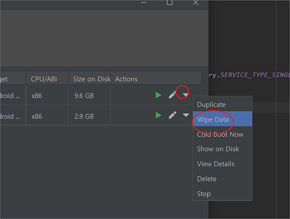 ▼ 문제가 되는 에뮬레이터를 초기화 하기 위해 화살표 버튼 > Wipe Data 를 메뉴를 클릭합니다. 해당 메뉴를 실행하기 전에 에뮬레이터는 종료해야 합니다.