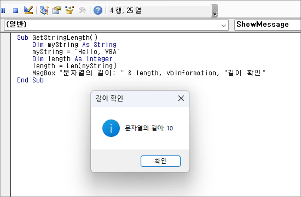 MsgBox "이 문자열의 길이: " & length, vbInformation, "길이 확인"