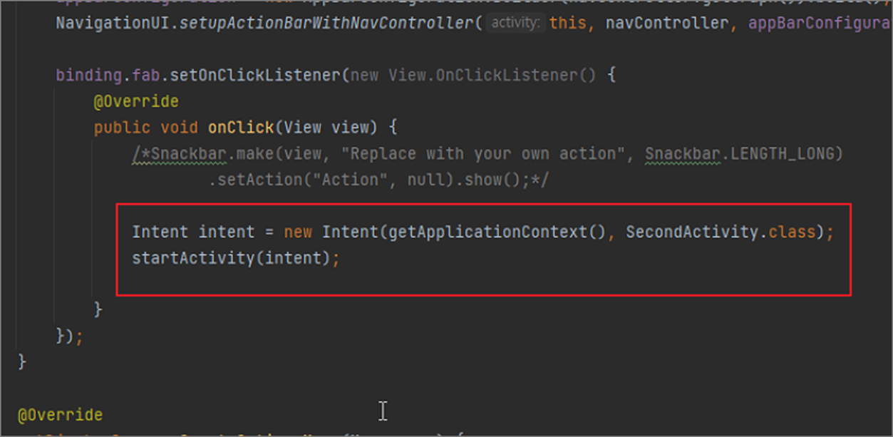 ▼ Android 의 모든 동작에 연결하는 Activity 는 AndroidManifest.xml 에 등록을 해야 합니다. AndroidManifest.xml 에는 서비스, 브로드캐스트 수신기 및 앱의 전체 동작을 포함하여 Android 앱의 다양한 구성 요소를 정의합니다. 아래소스는 Intent 를 이용해서 버튼을 클릭했을 때 SecondActivity 로 이동하려는 의도가 담겨있습니다.