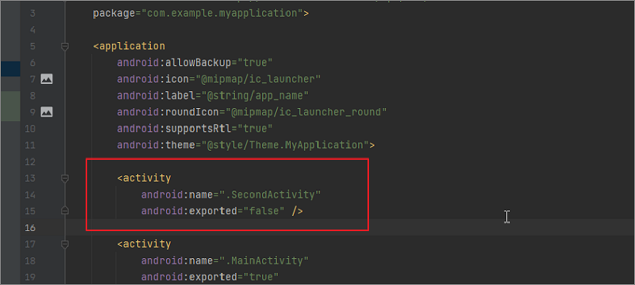 따라서 현재 선언한 <activity> 요소는 현재 패키지에 SecondActivity 클래스의 인스턴스를 생성하고 다른 앱에서 Activity 를 참조하지 못하게 차단합니다.