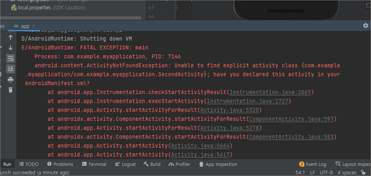 ▼ 만약 SecondActivity 클래스가 AndroidManifest.xml 에 등록되어 있지 않다면 어떻게 될까요? 아래와 같은 에러 메시지가 나타날 겁니다.