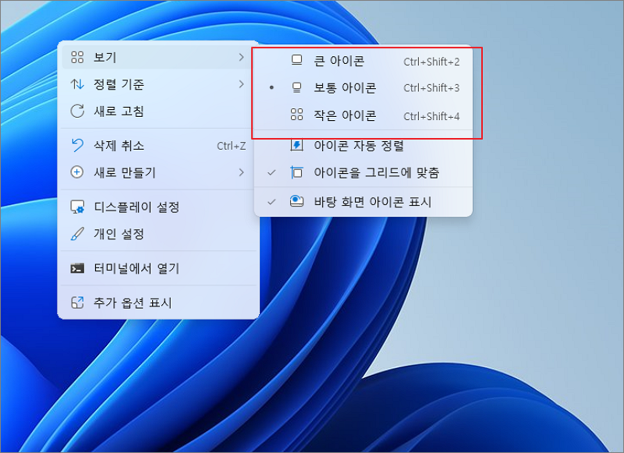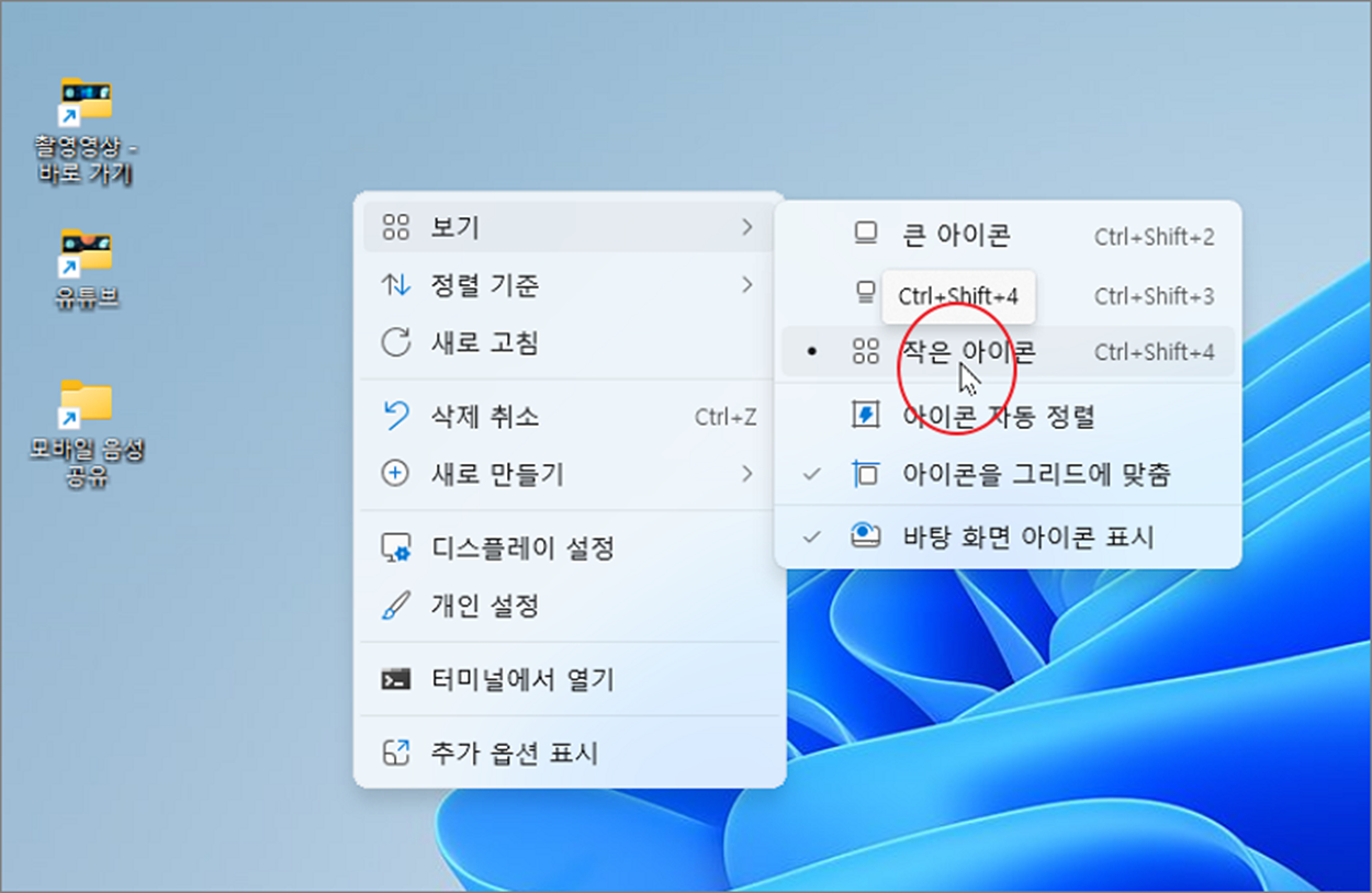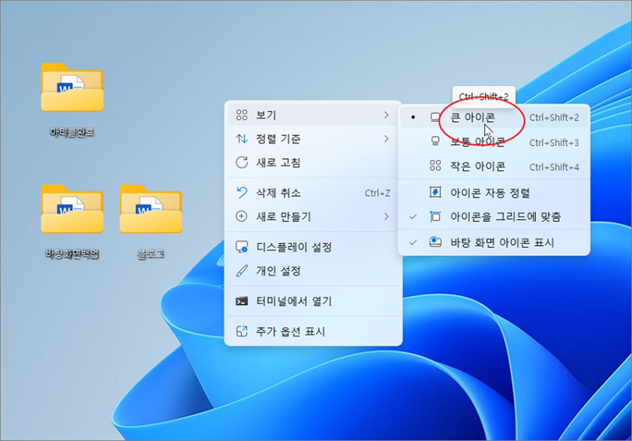 ▼ 윈도우11 에서 바탕화면의 아이콘 사이즈를 변경해 보겠습니다. 방법은 여러가지가 있습니다. 첫 번째 방법으로 바탕화면에서 오른쪽 마우스를 클릭합니다. 그리고 보기 메뉴로 갑니다. 보기 메뉴 하위에 보시면 "큰 아이콘", "보통 아이콘", "작은 아이콘" 이 보입니다.