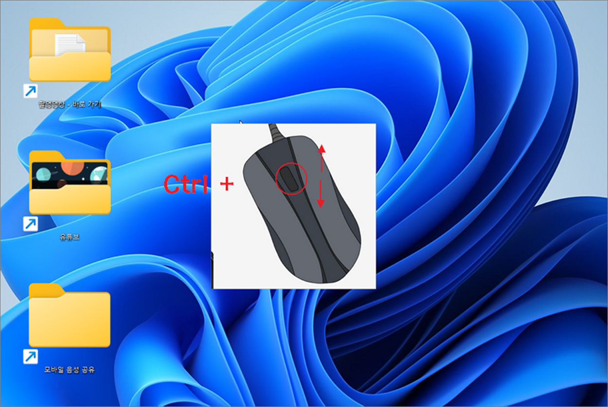 ▼ 두 번째는 키보드의 컨트롤 키와 마우스 휠을 이용하는 방법입니다. 키보드에서 컨트롤 키를 누르고 마우스 휠을 위로 올려 보세요. 바탕 화면 아이콘이 점점 커지는 것을 알 수 있습니다. 다시 반대로 휠을 내려 보세요. 점점 작아지죠. 이런 식으로 픽셀 단위로 아이콘을 키웠다가 줄일 수 있습니다.