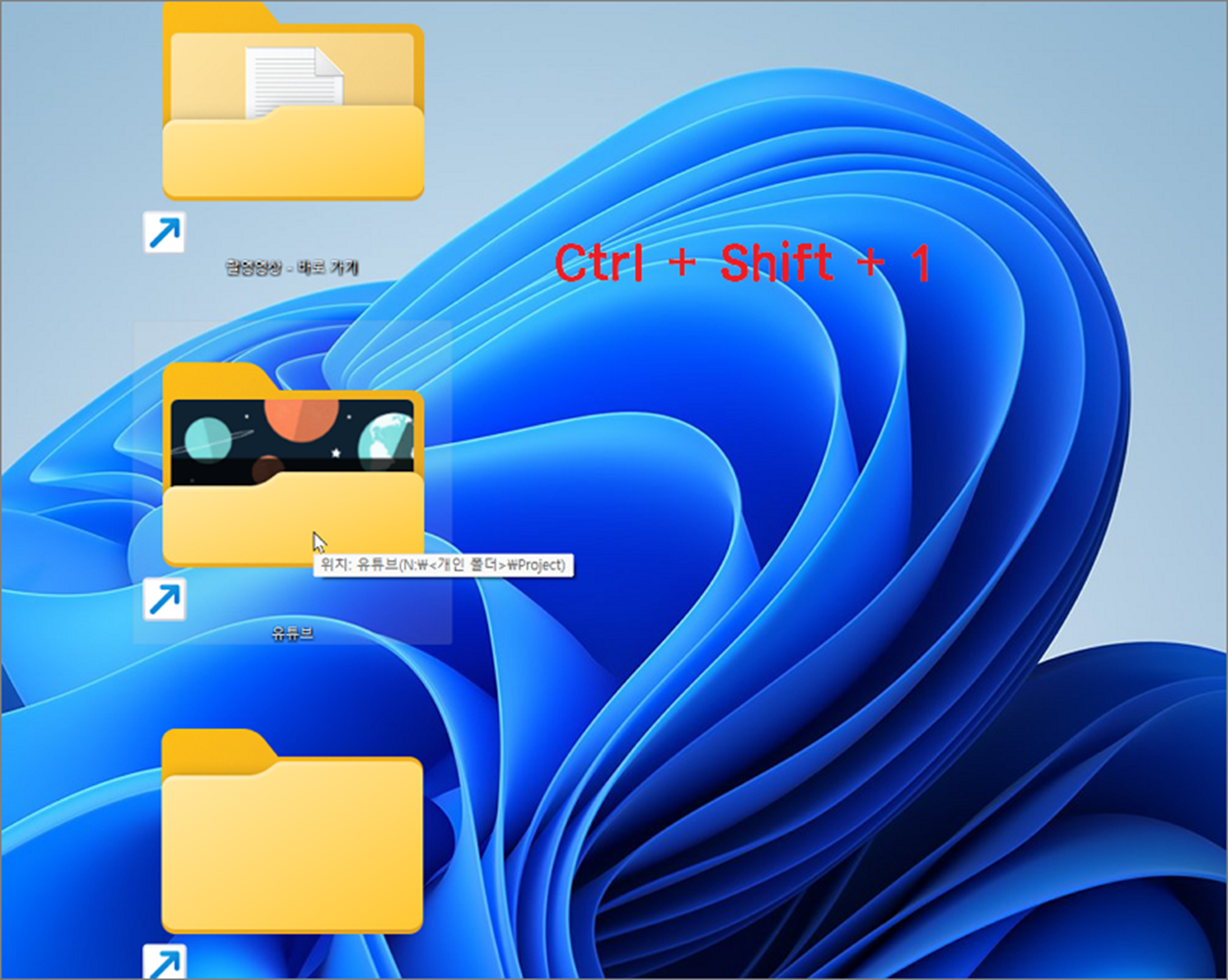 ▼ Ctrl + Shift 1 을 눌러 보세요. 바탕화면의 아이콘이 커졌습니다.