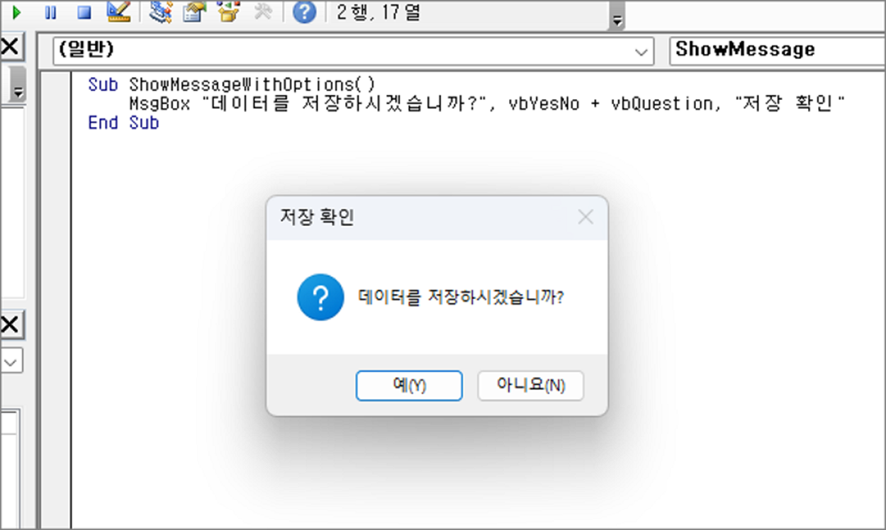 MsgBox "데이터를 저장하시겠습니까?", vbYesNo + vbQuestion, "저장 확인"