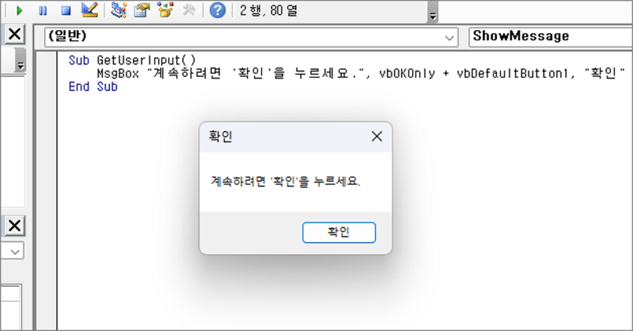 MsgBox "계속하려면 '확인'을 누르세요.", vbOKOnly + vbDefaultButton1, "확인"