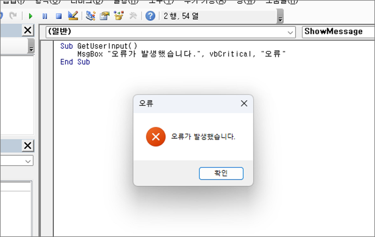 MsgBox "오류가 발생했습니다.", vbCritical, "오류"