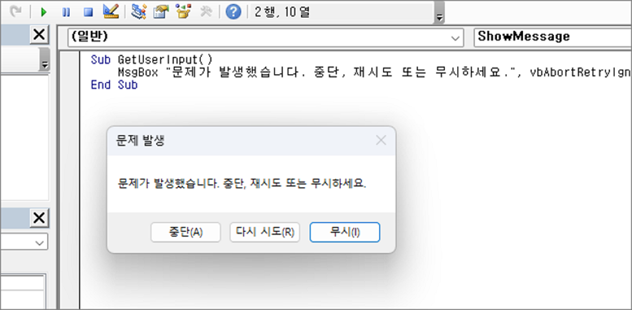 MsgBox "문제가 발생했습니다. 중단, 재시도 또는 무시하세요.", vbAbortRetryIgnore, "문제 발생"