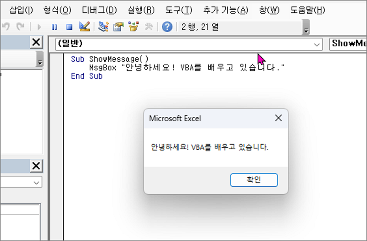 MsgBox "안녕하세요! VBA를 배우고 있습니다."