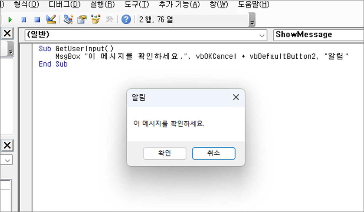 MsgBox "이 메시지를 확인하세요.", vbOKCancel + vbDefaultButton2, "알림"