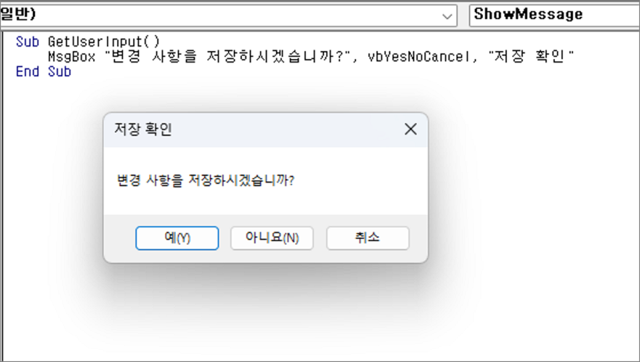 MsgBox "변경 사항을 저장하시겠습니까?", vbYesNoCancel, "저장 확인"