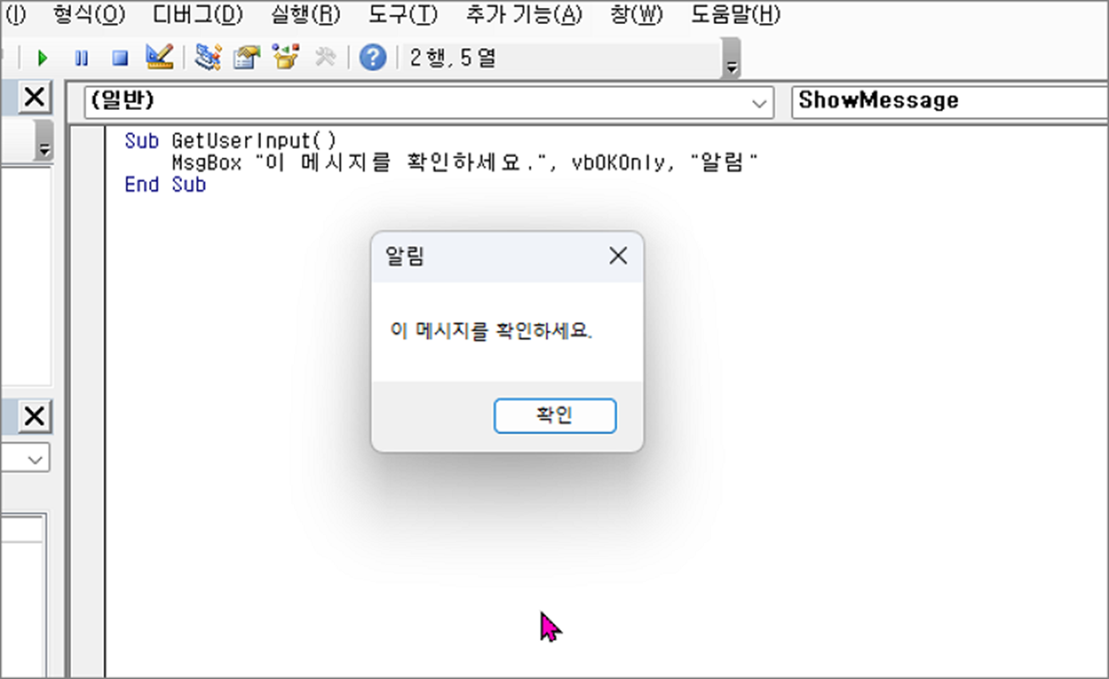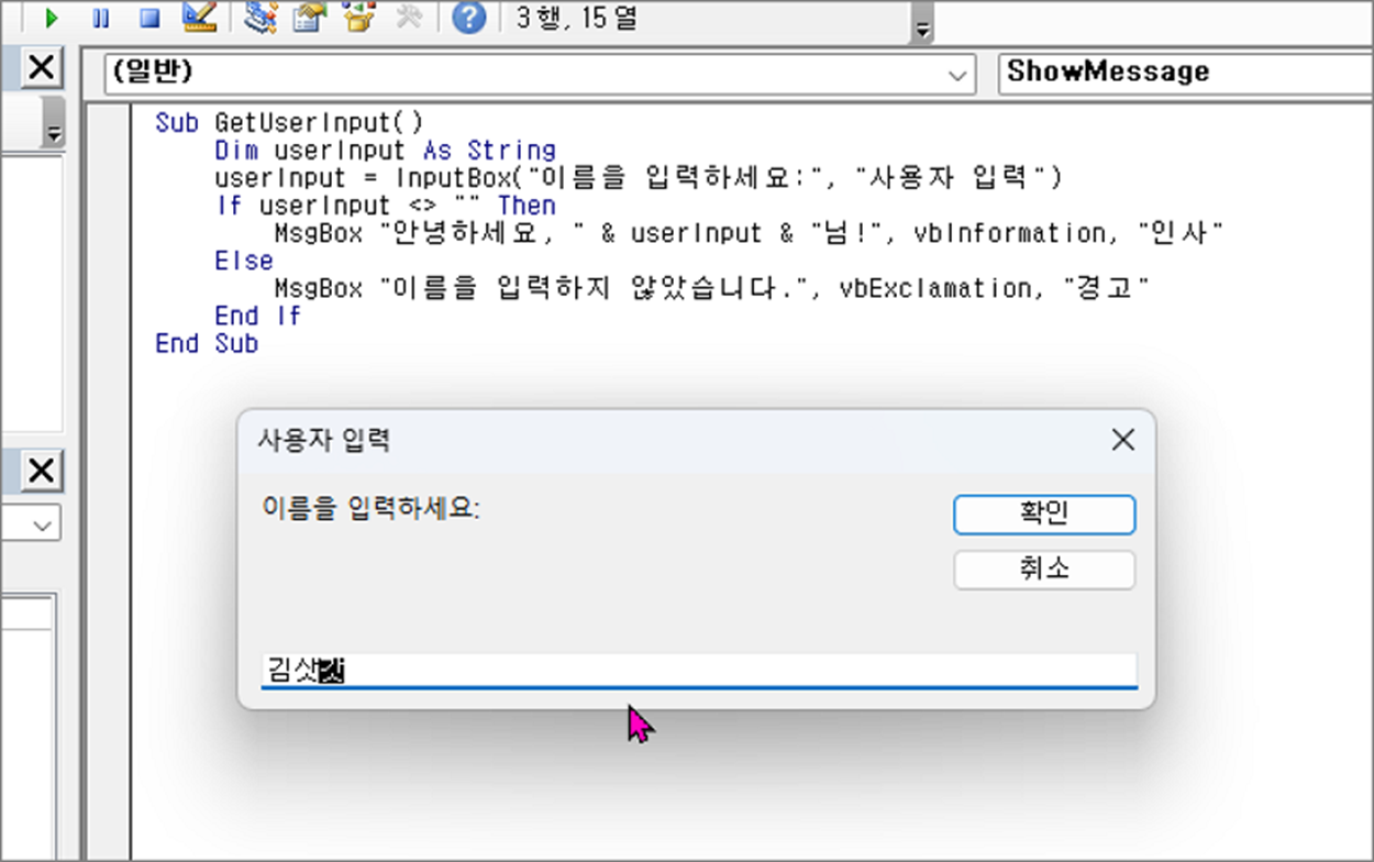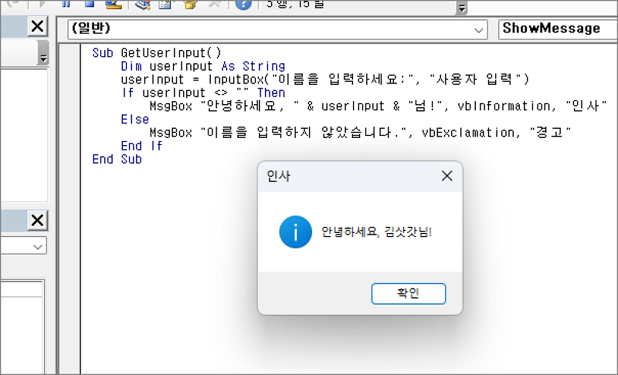 MsgBox "안녕하세요, " & userInput & "님!", vbInformation, "인사"