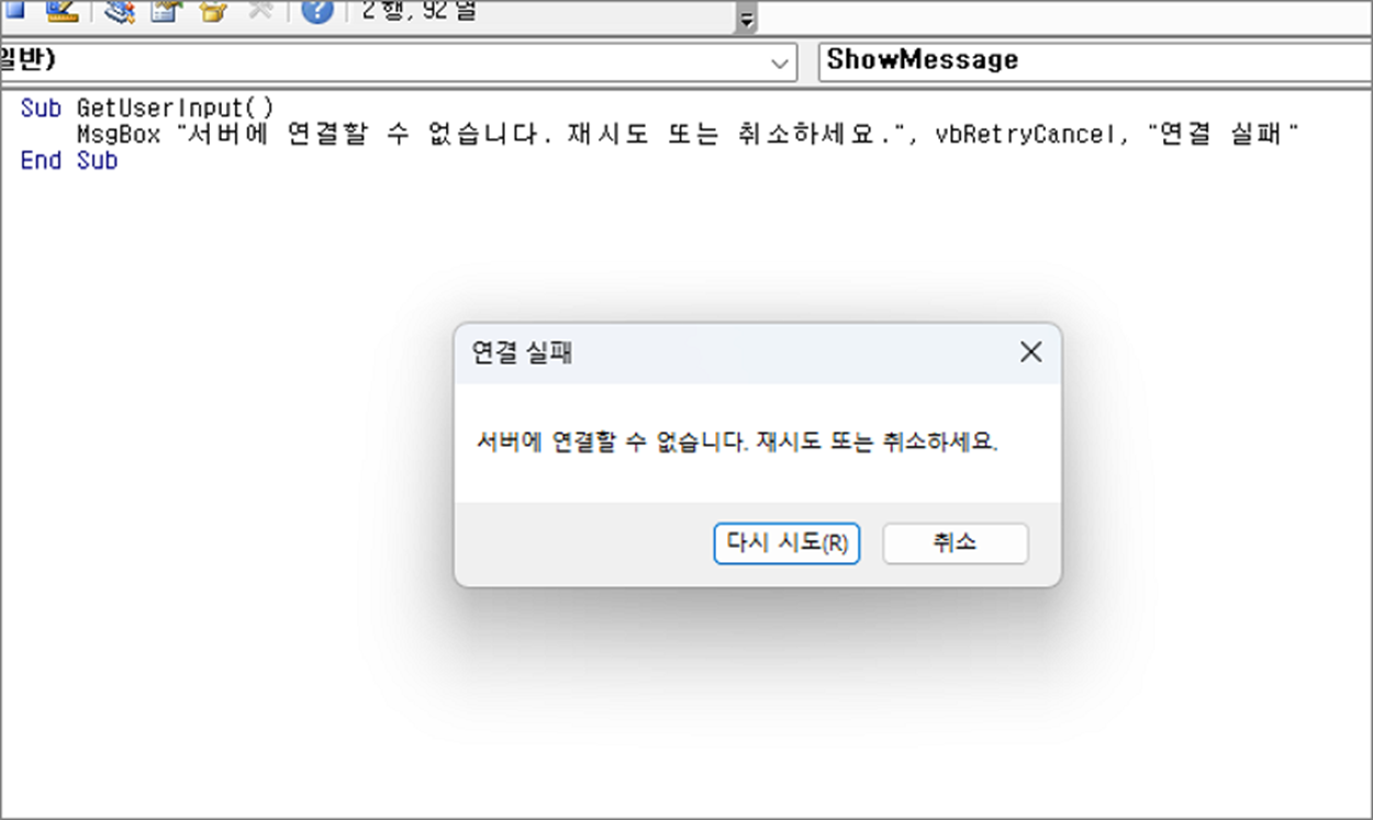 MsgBox "서버에 연결할 수 없습니다. 재시도 또는 취소하세요.", vbRetryCancel, "연결 실패"