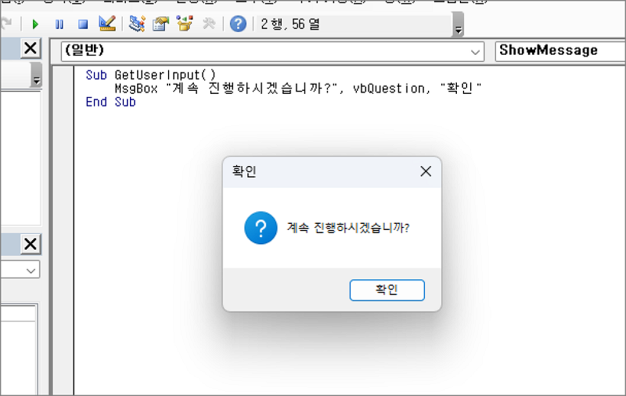 MsgBox "계속 진행하시겠습니까?", vbQuestion, "확인"