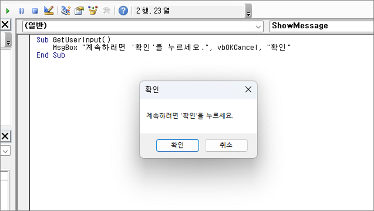 MsgBox "계속하려면 '확인'을 누르세요.", vbOKCancel, "확인"