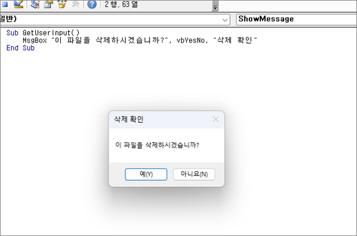 MsgBox "이 파일을 삭제하시겠습니까?", vbYesNo, "삭제 확인"