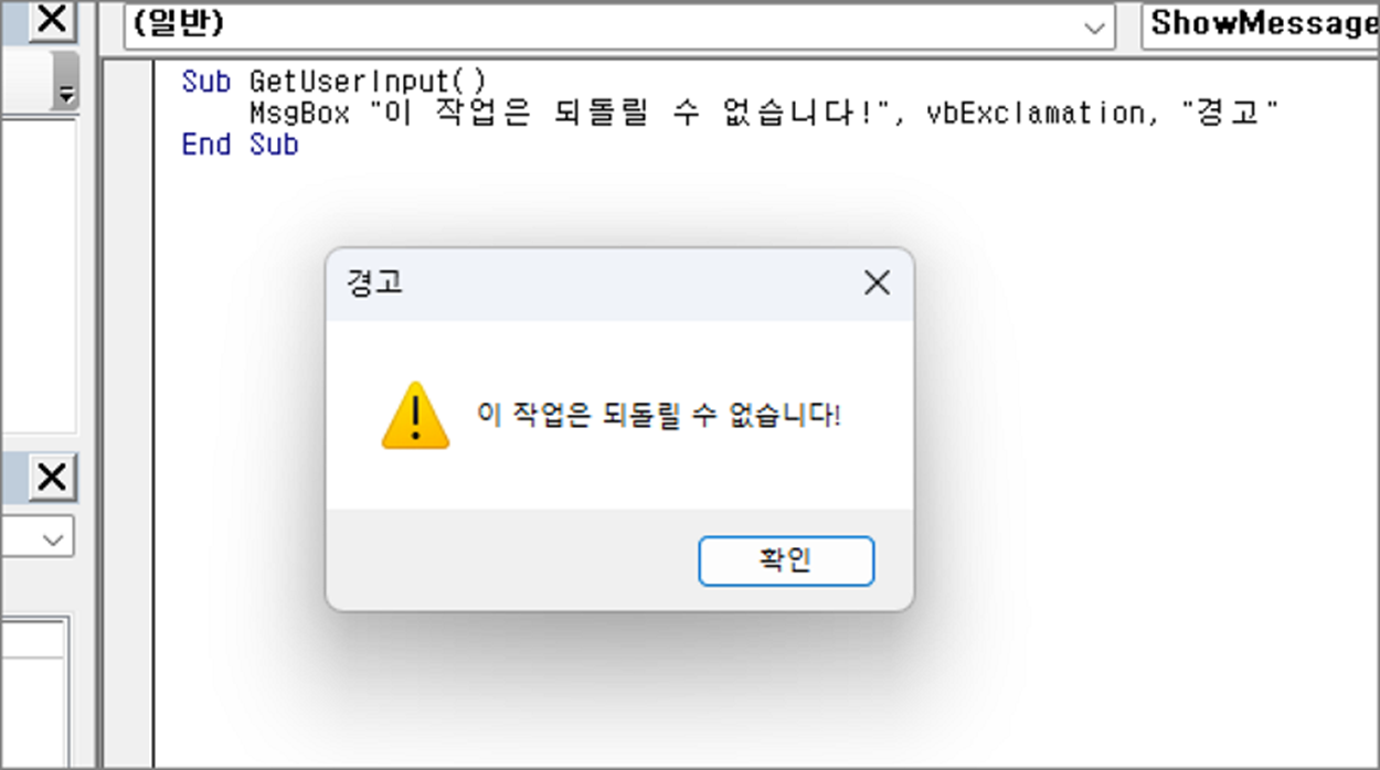 MsgBox "이 작업은 되돌릴 수 없습니다!", vbExclamation, "경고"