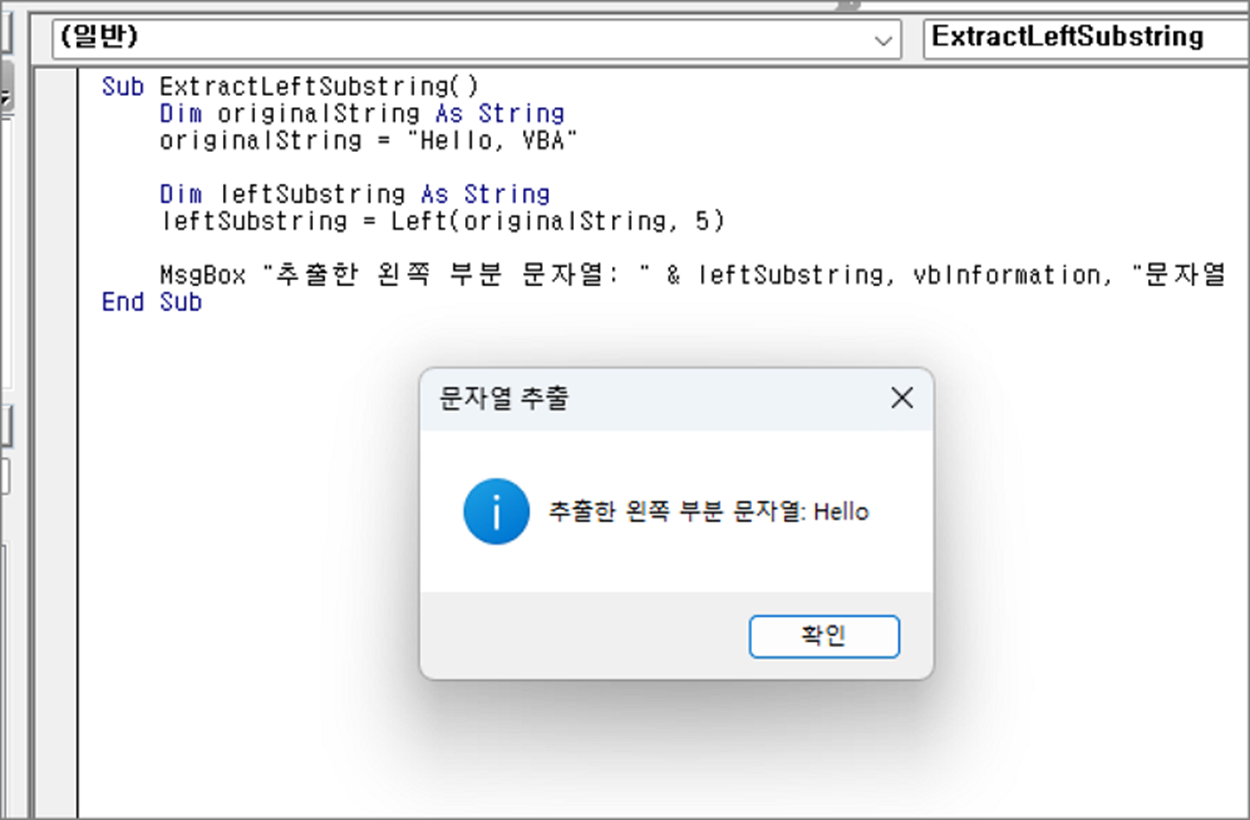 예제에서는 "Hello, VBA" 문자열의 왼쪽에서 5개의 문자를 추출합니다. [Left] 함수를 사용하여 문자열의 왼쪽 부분을 추출하고 그 결과를 메시지 상자에 표시합니다.