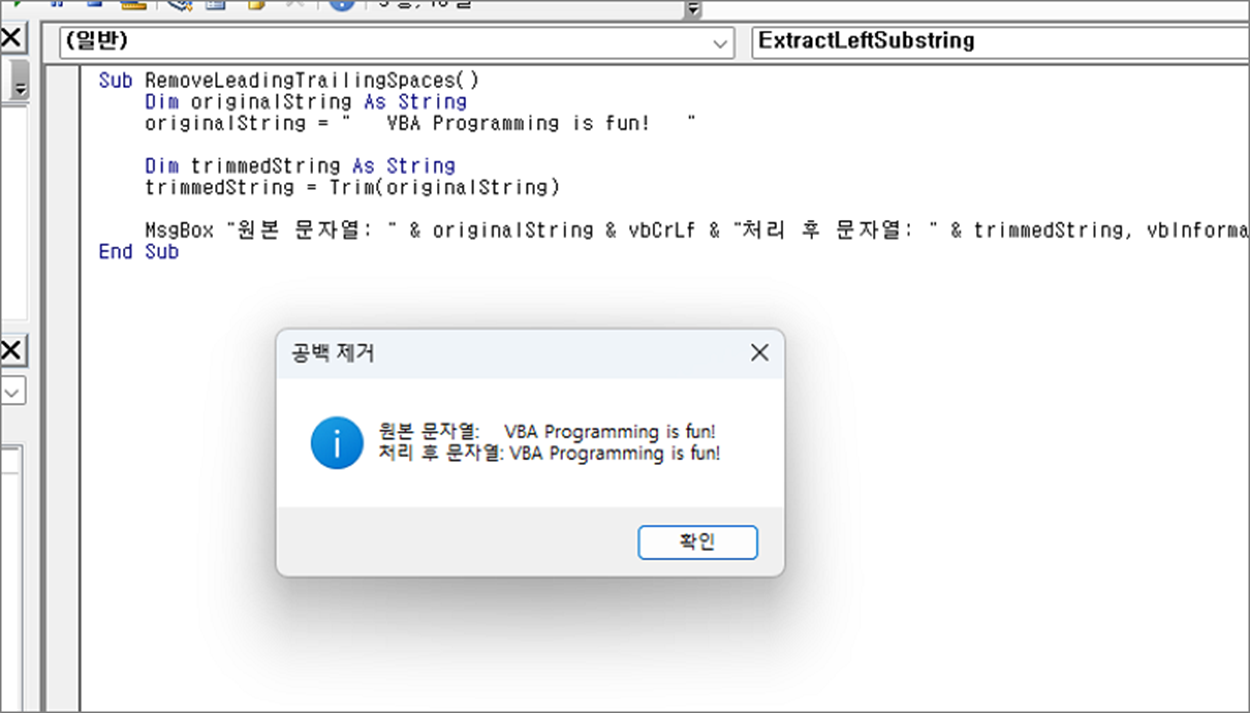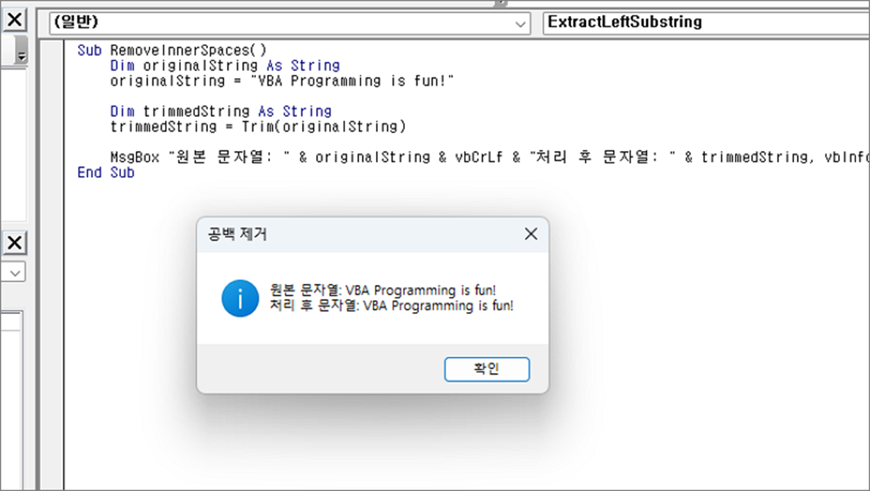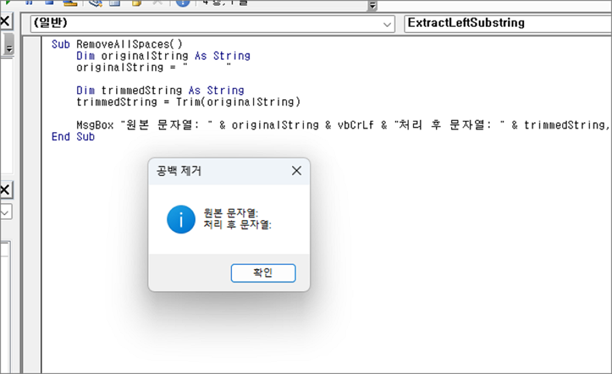 MsgBox "원본 문자열: " & originalString & vbCrLf & "처리 후 문자열: " & trimmedString, vbInformation, "공백 제거"