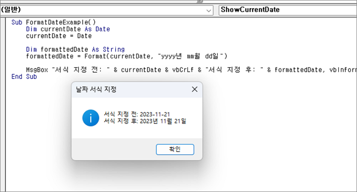 MsgBox "서식 지정 전: " & currentDate & vbCrLf & "서식 지정 후: " & formattedDate, vbInformation, "날짜 서식 지정"