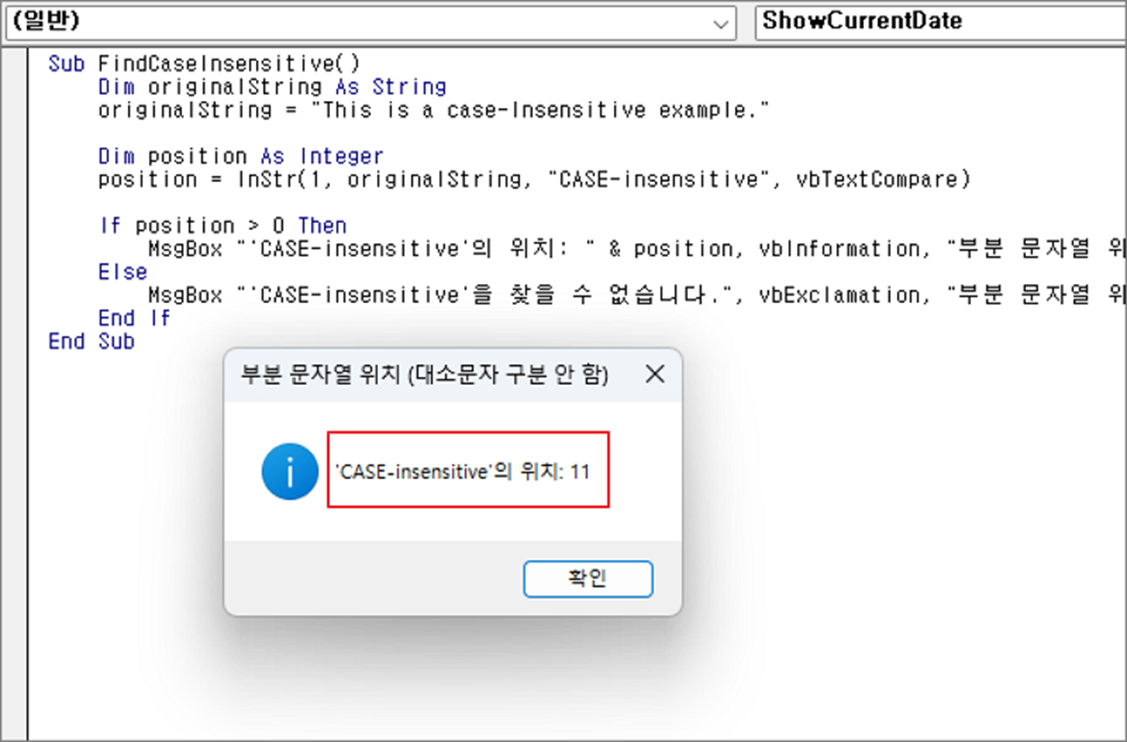 MsgBox "'CASE-insensitive'의 위치: " & position, vbInformation, "부분 문자열 위치 (대소문자 구분 안 함)"