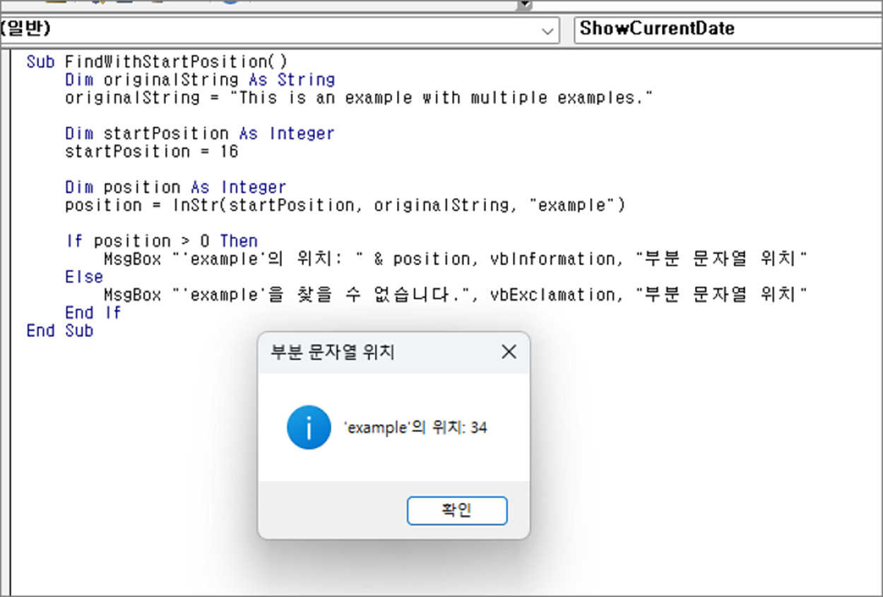 MsgBox "'example'의 위치: " & position, vbInformation, "부분 문자열 위치"