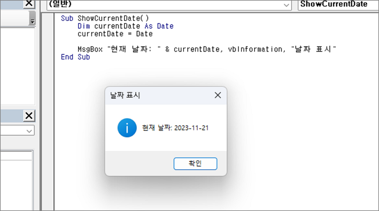 MsgBox "현재 날짜: " & currentDate, vbInformation, "날짜 표시"