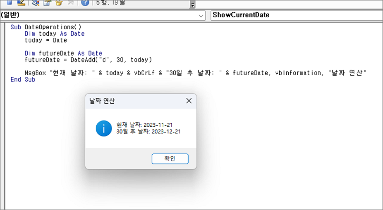 MsgBox "현재 날짜: " & today & vbCrLf & "30일 후 날짜: " & futureDate, vbInformation, "날짜 연산"