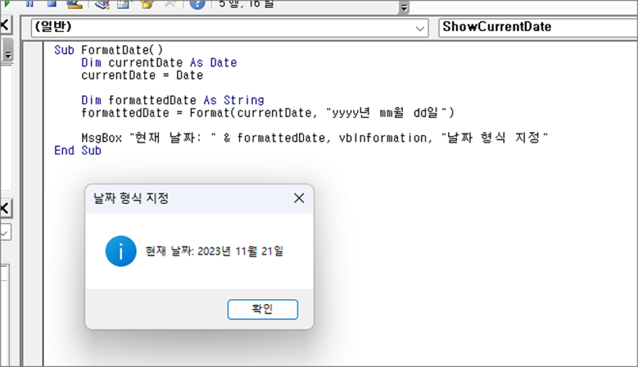 MsgBox "현재 날짜: " & formattedDate, vbInformation, "날짜 형식 지정"