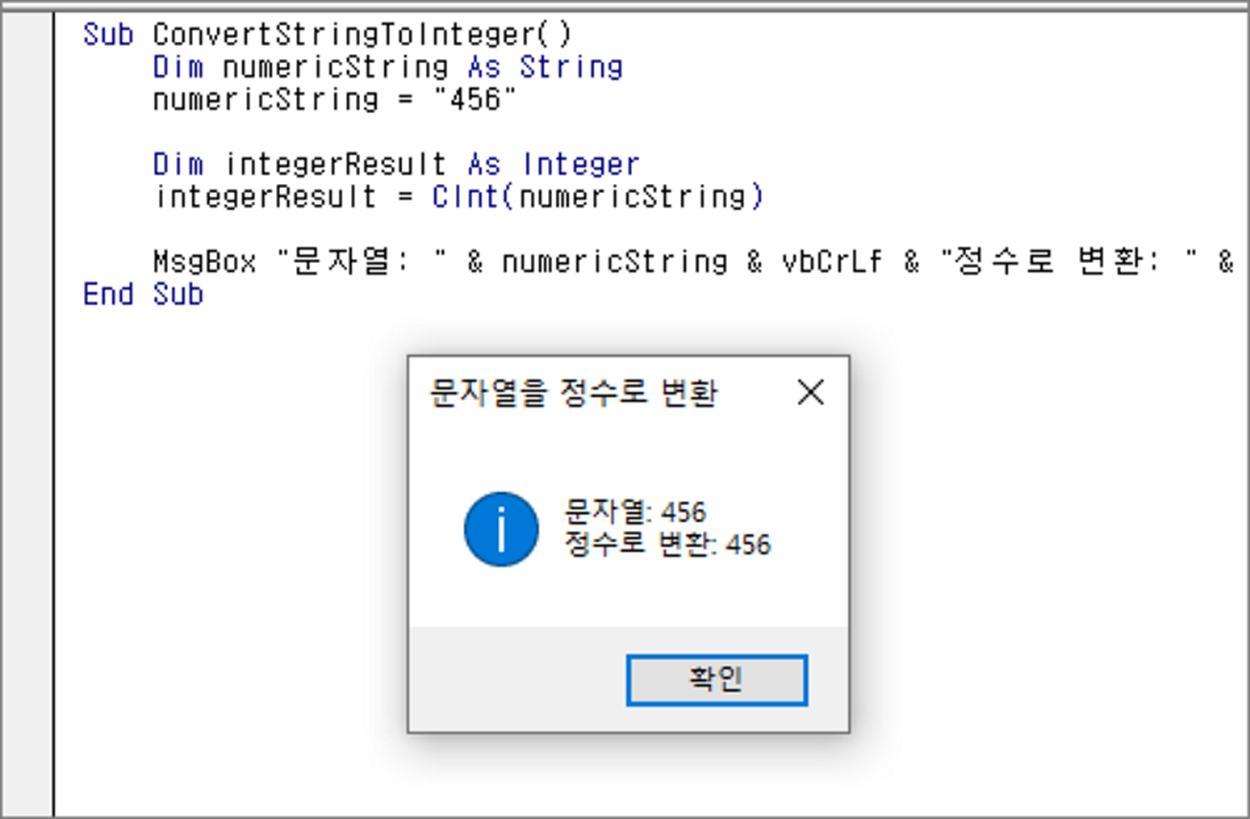 MsgBox "문자열: " & numericString & vbCrLf & "정수로 변환: " & integerResult, vbInformation, "문자열을 정수로 변환"