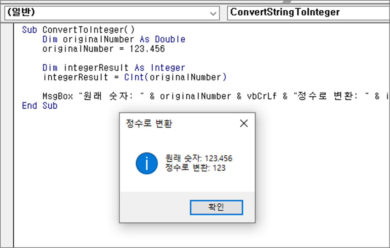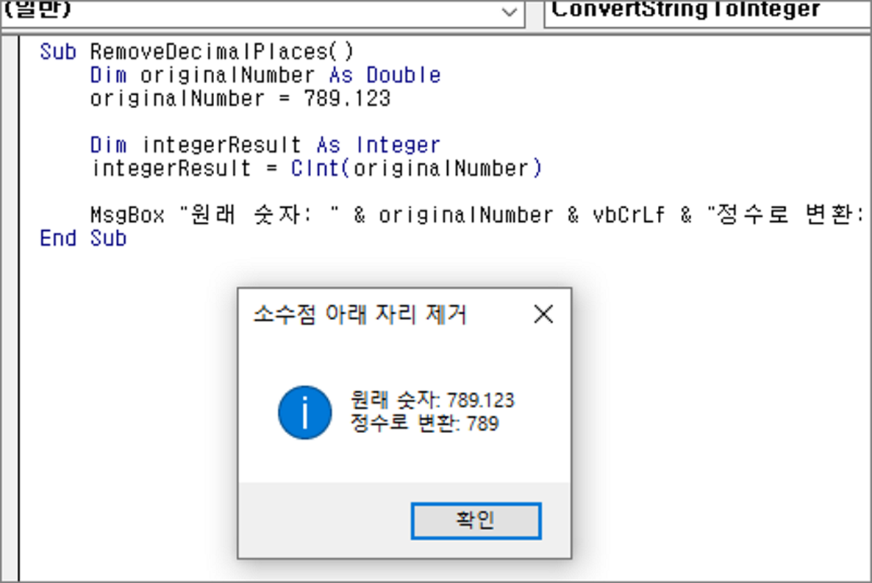 MsgBox "원래 숫자: " & originalNumber & vbCrLf & "정수로 변환: " & integerResult, vbInformation, "정수로 변환"