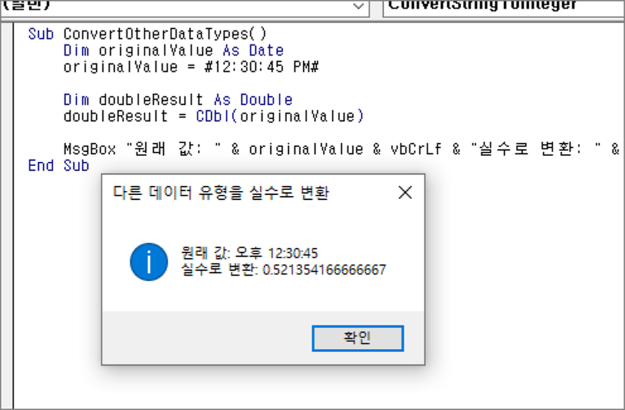 MsgBox "원래 값: " & originalValue & vbCrLf & "실수로 변환: " & doubleResult, vbInformation, "다른 데이터 유형을 실수로 변환"