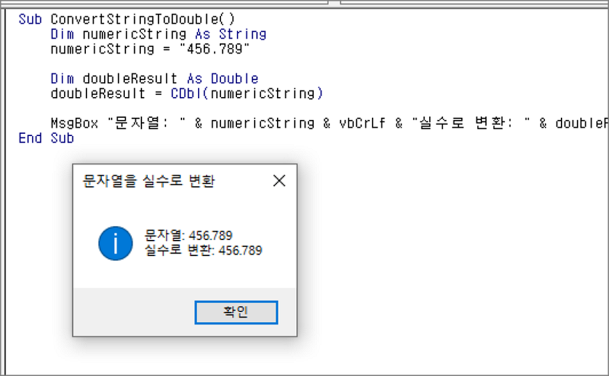 MsgBox "문자열: " & numericString & vbCrLf & "실수로 변환: " & doubleResult, vbInformation, "문자열을 실수로 변환"