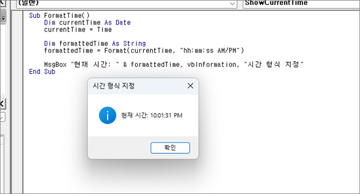 MsgBox "현재 시간: " & formattedTime, vbInformation, "시간 형식 지정"
