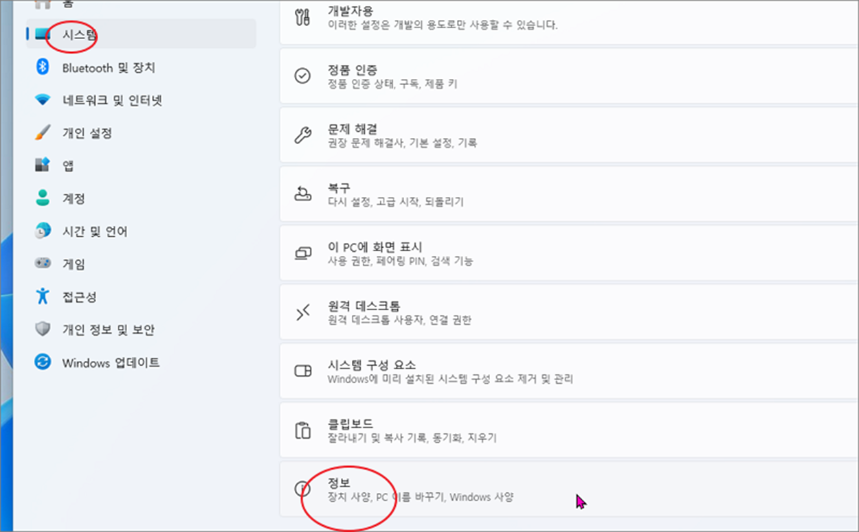 ▼ 다음 시스템 메뉴를 선택합니다. 그리고 아래로 내려가시면 "정보" 항목을 클릭합니다.